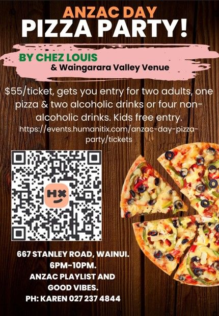 Join us for a relaxed ANZAC Day evening filled with great food, good vibes, and an epic playlist. Hosted by Chez Louis & Waingarara Valley Venue, this Pizza Party is the perfect way to spend ANZAC Day with friends and community.