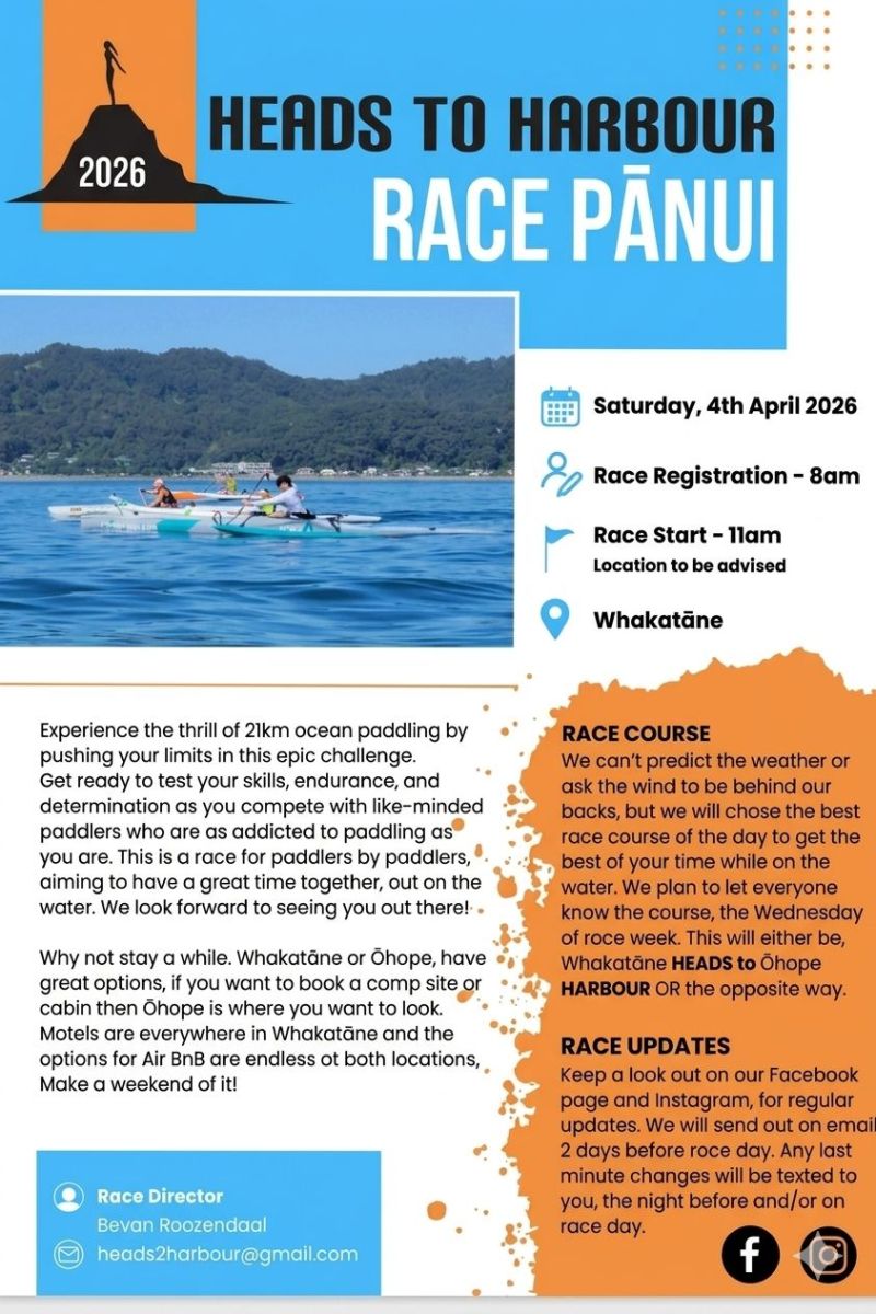 The Heads2Harbour Race returns for its 6th edition in 2026, bringing together elite and recreational Waka Ama and Surf Ski paddlers from across New Zealand for a thrilling 21km coastal challenge. Spectators can enjoy the action from Whakatāne Heads or Ōhope Harbour, with the start and finish determined by race conditions closer to the day.