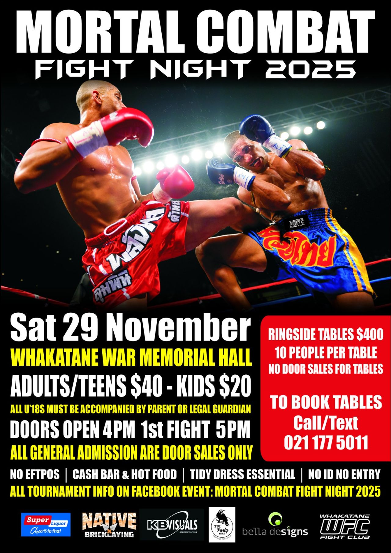 Sat 29 Nov: Doors open 4pm. First fight at 5pm sharp.